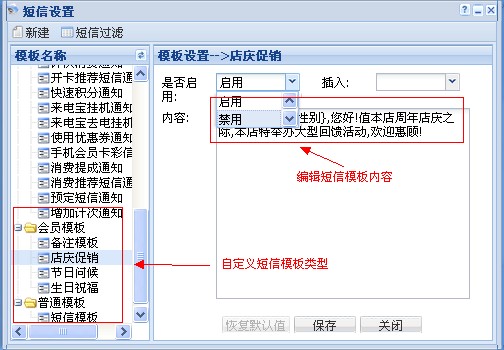 2、定義短信模板:可重新設置所有短信模板,短信尾部可綴上最新的促銷優惠信息。