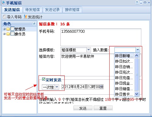(5) 老板手機自動接收營業數據,軟件自動將每天的營業數據,如銷售額,新增會員數,充值金額等定時發送到老板手機。