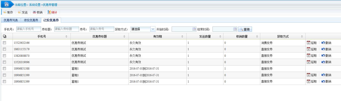 5、管理優惠券中可查看已發優惠券和待發優惠券等功能,同時,可核銷查詢會員優惠券。