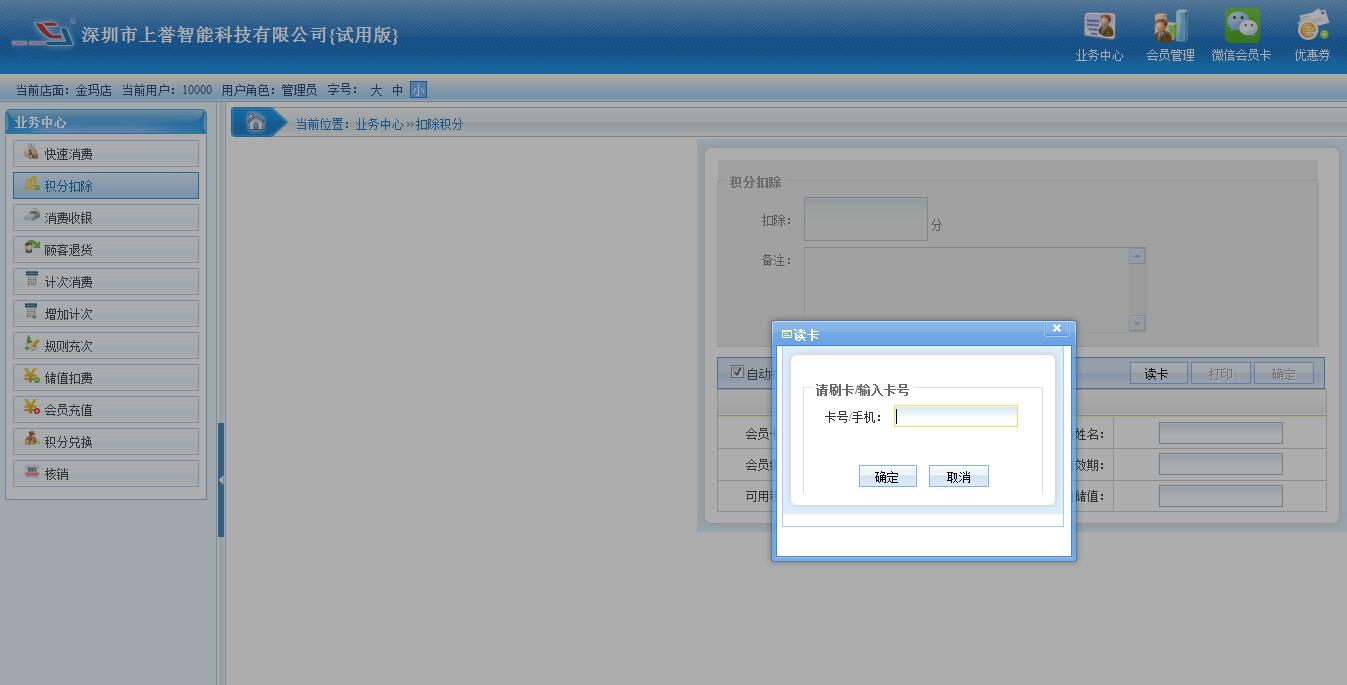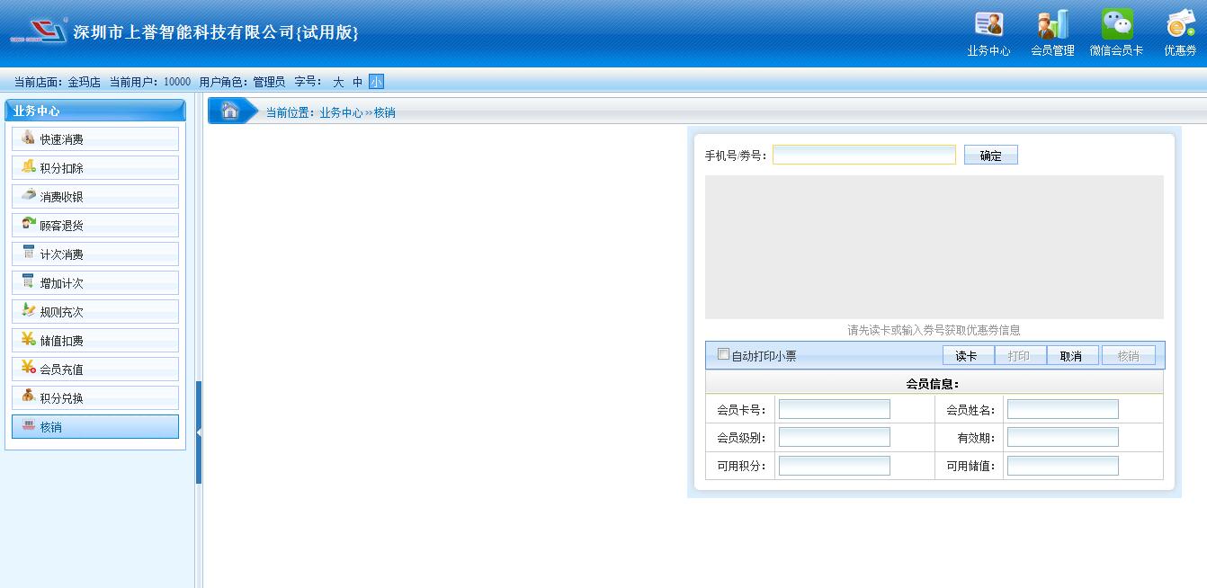 會員管理功能有:快速消費、積分扣除、消費收銀、顧客退貨、計次消費、增加計次、規則充次、儲值扣費、會員充值、積分兌換、核銷等等。