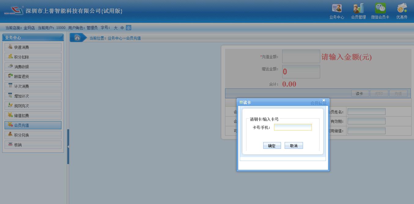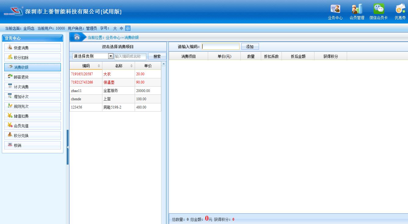 消費收銀:用于會員在消費中,選擇的商品以及消費總金額的消費收費使用。