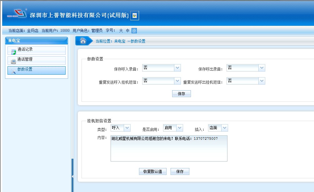參數設置:用于設置保存呼入錄音、保存呼出錄音、重復發送呼入掛機短信、重復發送呼出掛機短信以及掛機短信設置功能等。