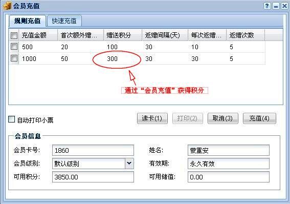 通過消費積分累計,讓會員客戶真正得到實惠,享受到尊貴的增值服務,進而形成忠誠消費,建立穩固客戶資源。 1、快速積分: 適用于無需記錄會員消費明細,直接累加積分的情況 直接輸入消費金額,軟件自動按照積分比例累加積分(或者直接輸入積分數量獲得積分)。