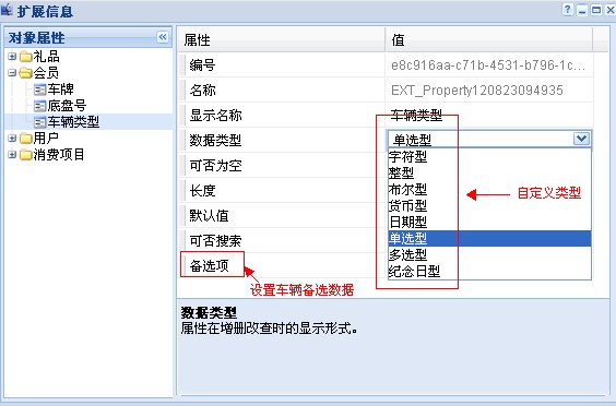 自定義字段功能可存儲會員的不同類型個性化數據,可設置字符,是否,數值型,單選,多選,下拉,日期等類型,并可設置字段長度,默認值,以及字段備選內容等。比如:汽車行業可設置車牌號,底盤號,車架號,保險到期日期;眼鏡行業可設置眼鏡度數;兒童樂園可設置家長聯系方式;珠寶行業可設定結婚紀念日;服裝行業可記錄會員喜歡的顏色和尺碼;餐飲行業可記錄會員口味禁忌。