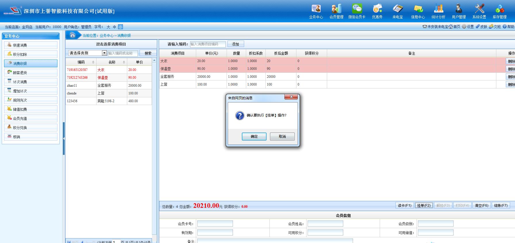 2、散客消費(fèi): 支持正常的收銀業(yè)務(wù)。‘散客消費(fèi)’(即無(wú)卡會(huì)員),無(wú)需讀卡,直接選擇消費(fèi)項(xiàng)目,然后結(jié)賬即可。