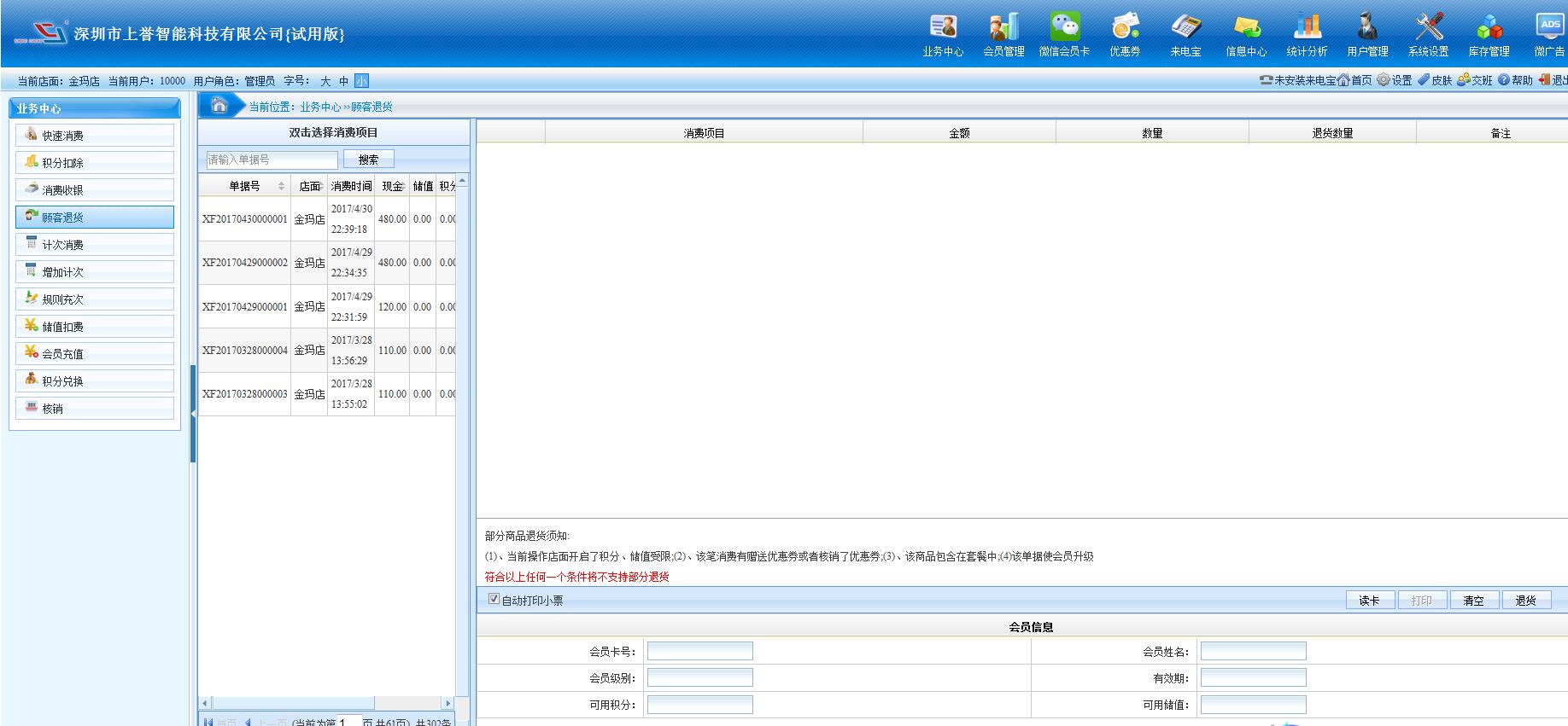 4、會(huì)員退貨:若會(huì)員買單消費(fèi)后,需要退貨時(shí),可通過(guò)‘會(huì)員退貨’功能,將會(huì)員之前的消費(fèi)進(jìn)行退貨處理,系統(tǒng)自動(dòng)將支付的‘現(xiàn)金、儲(chǔ)值、積分’等返回給會(huì)員,同時(shí)將對(duì)應(yīng)購(gòu)買產(chǎn)品獲得的積分扣除(支持整單退貨,或單件商品退貨)。